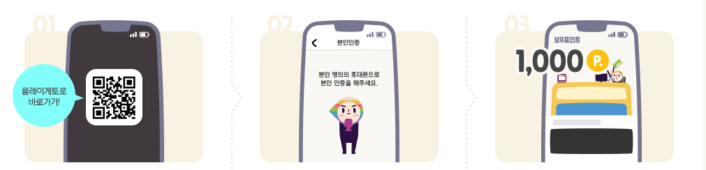 플레이게토에 접속하고 신규 가입한 다음 > 이벤트 참여를 위해 본인 인증을 완료하면 > 1000포인트가 적립됩니다.