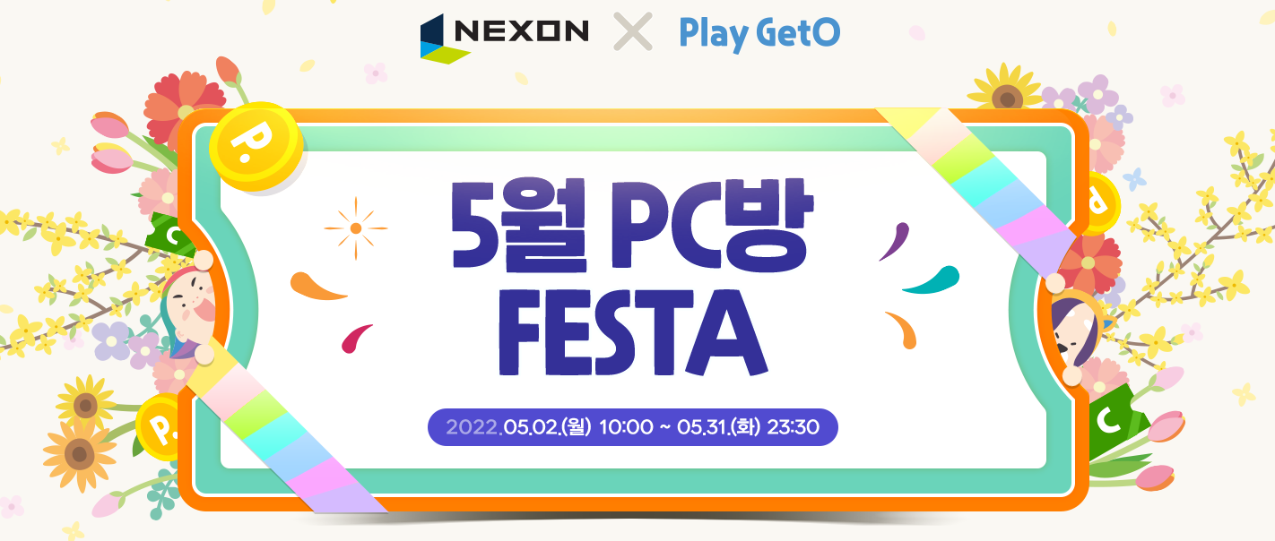 넥슨 x 플레이게토 콜라보 5월 pc방 페스타 이벤트에 참여하면 역대급 넥슨 게임 쿠폰을 받을 수 있다고 합니다.