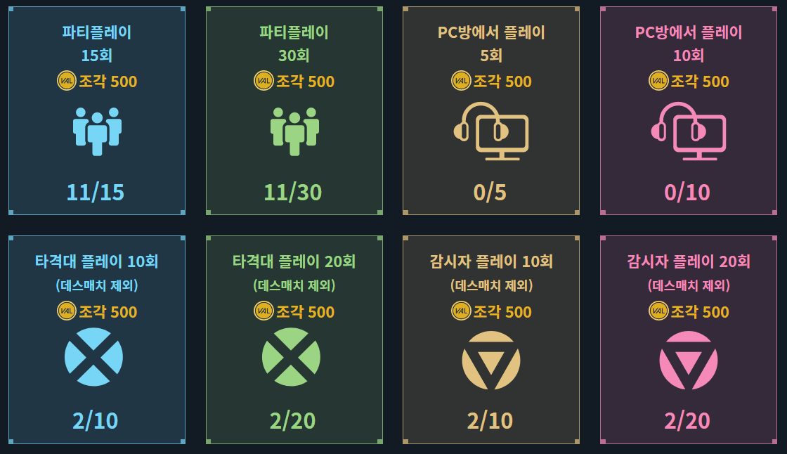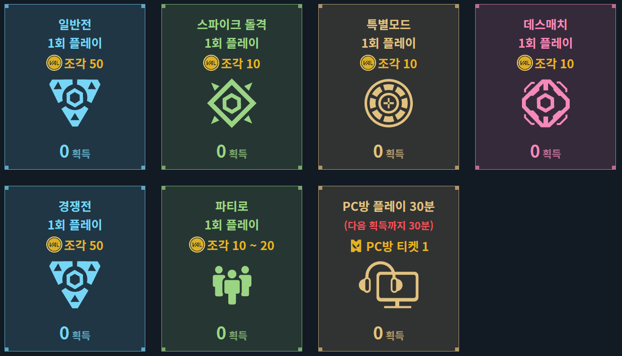 일일 획득 가능한 VAL 조각은 200개입니다. pc방에서는 추가로 최대 200 VAL 조각까지 동시 획득 가능합니다.