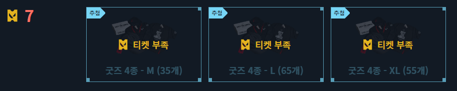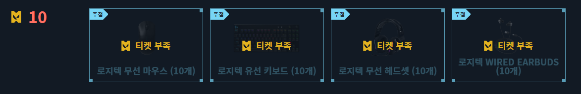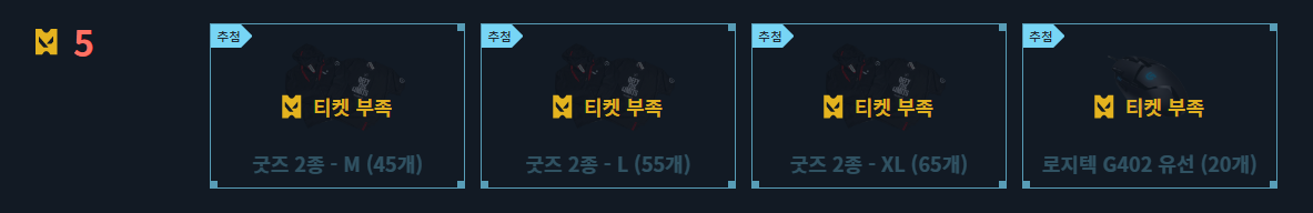 굿즈 2종-M(45개), 굿즈 2종-L(55개), 굿즈 2종-XL(65개), 로지텍 G402 유선(20개)