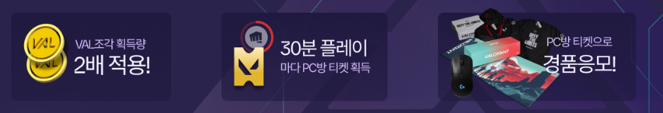 pc방에서 발로란트 플레이 시 VAL조각 획득량 2배 적용, 30분 플레이 마다 pc방 티켓을 획득합니다.
