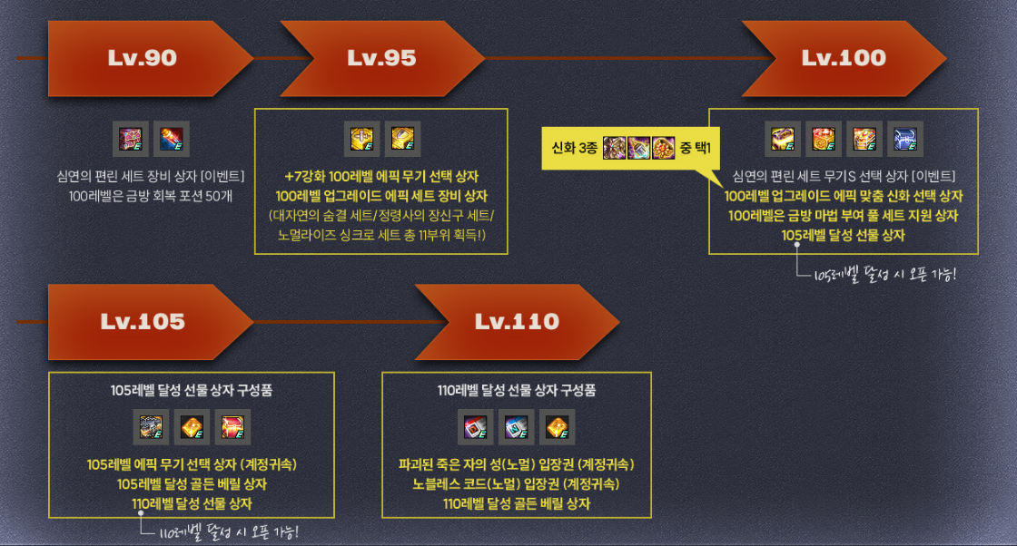 95레벨 달성 보상 : +7강화 100레벨 에픽 무기 선택 상자, 100레벨 업그레이드 에픽 세트 장비 상자