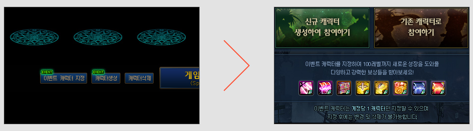 이벤트는 신규 캐릭터를 생성하거나 100레벨 이하의 기존 캐릭터로 참여할 수 있습니다. (계정당 1개의 캐릭터 선택)