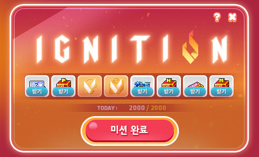 일일 미션 완료 후 이그니션 미션 창을 열어 [미션 완료] 버튼을 누르면 일일 보상을 받을 수 있습니다.