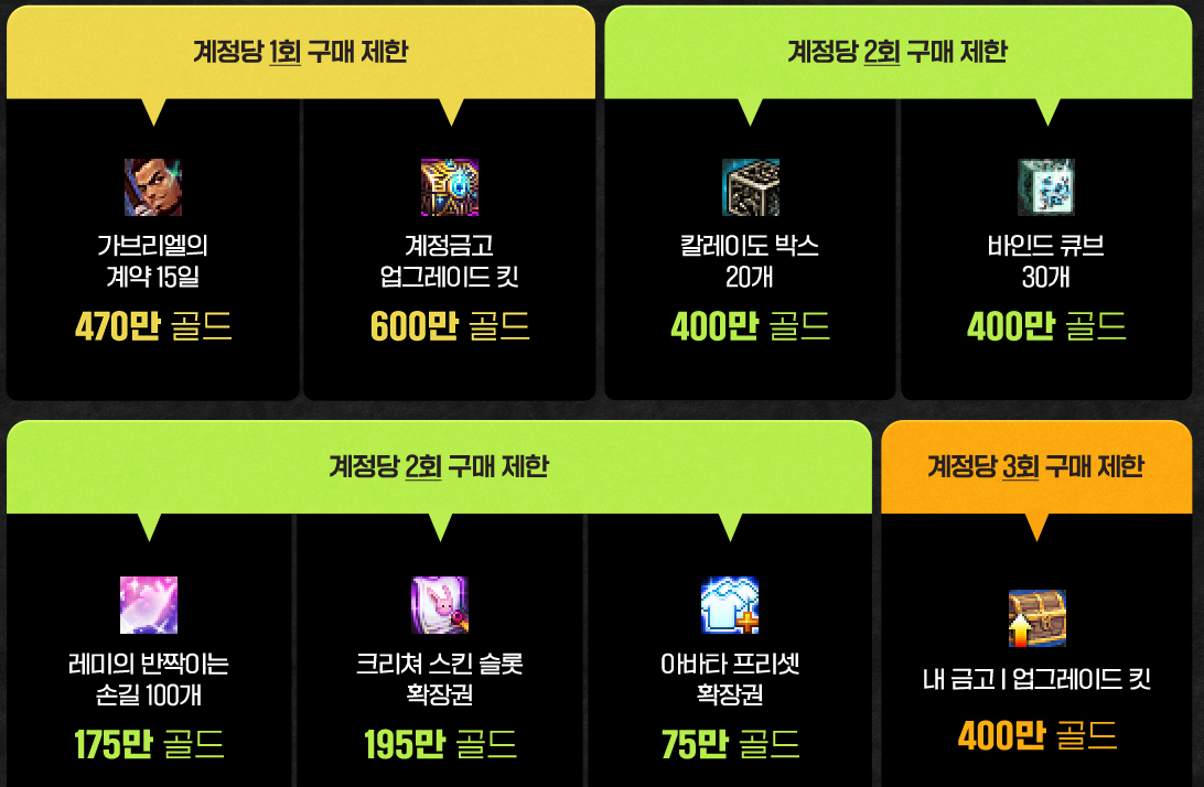 | 계정금고 업그레이드 킷 | 계정귀속 | 계정당 1회 구매 가능 | 600만 골드 |