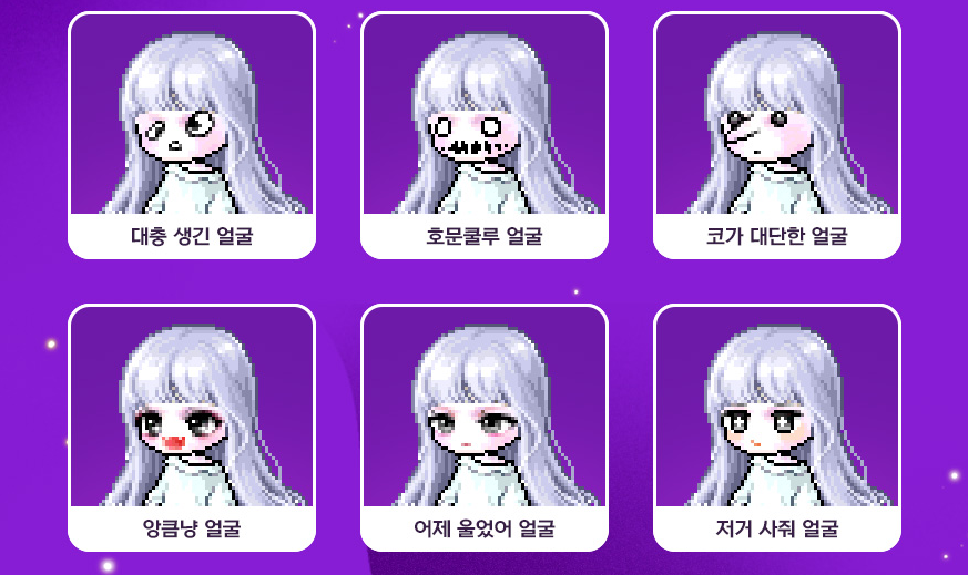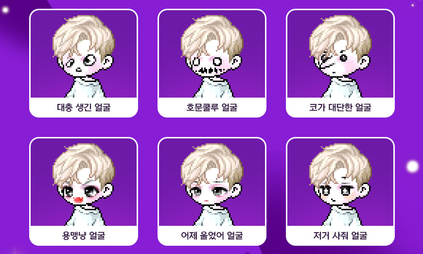 대충 생긴 얼굴 / 호문쿨루 얼굴 / 코가 대단한 얼굴 / 앙큼냥 얼굴 / 어제 울었어 얼굴 / 저거 사줘 얼굴 /
