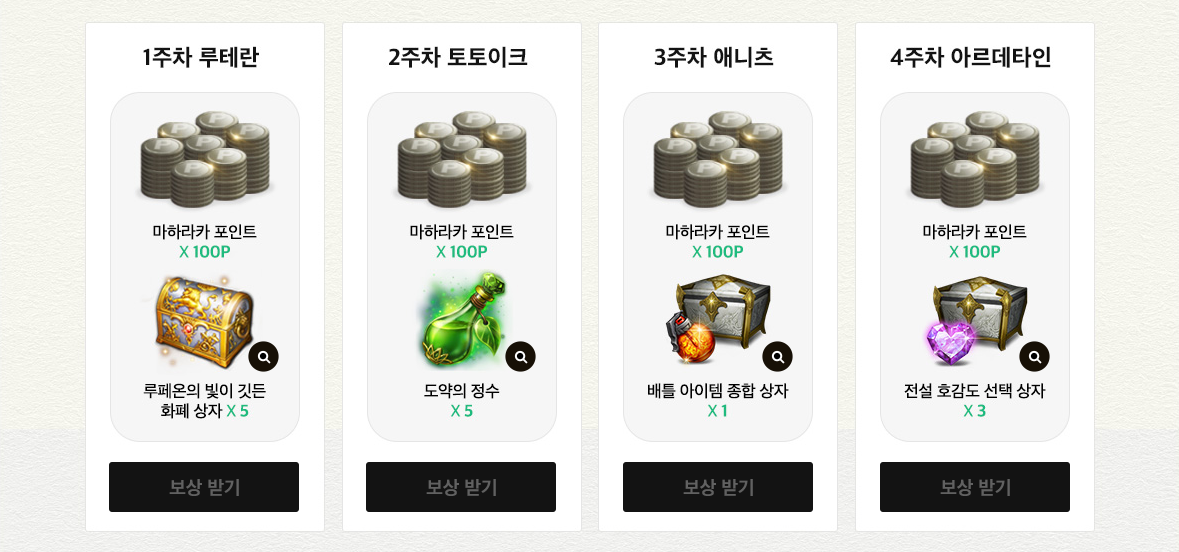 | 1주차 루테란 | 마하라카 포인트 x100p, 루페온의 빛이 깃든 화폐 상자 5개 |