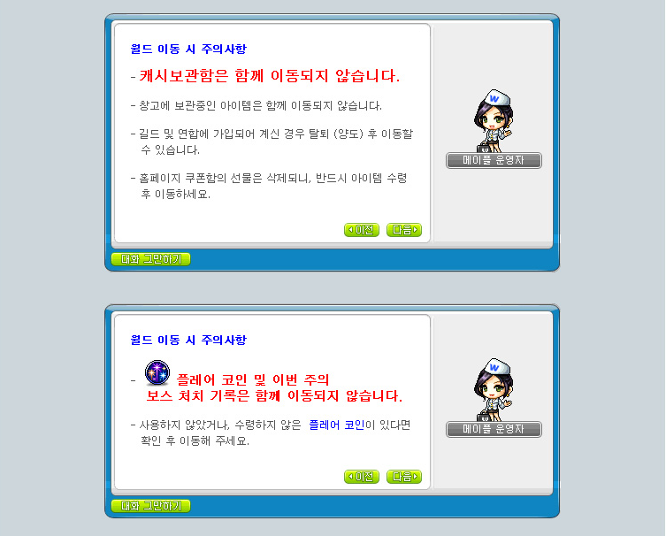 캐시 보관함과 창고에 보유하고 있는 아이템은 이동되지 않으니 월드 리프 전 미리 인벤토리로 이동해주세요!!
