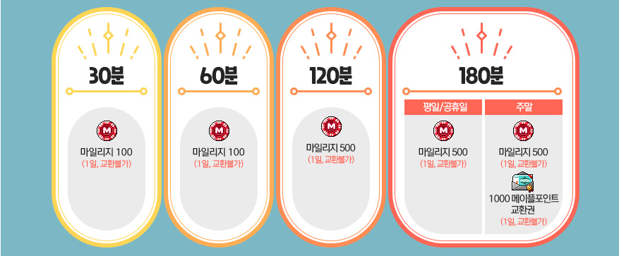 180분 접속 시 : 평일/공휴일 마일리지 500 / 주말 마일리지 500, 1000 메이플포인트 교환권