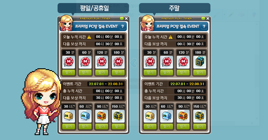 이벤트 기간 중 매일 프리미엄 PC방에 접속한 시간에 따라 보상을 지급 받을 수 있습니다.