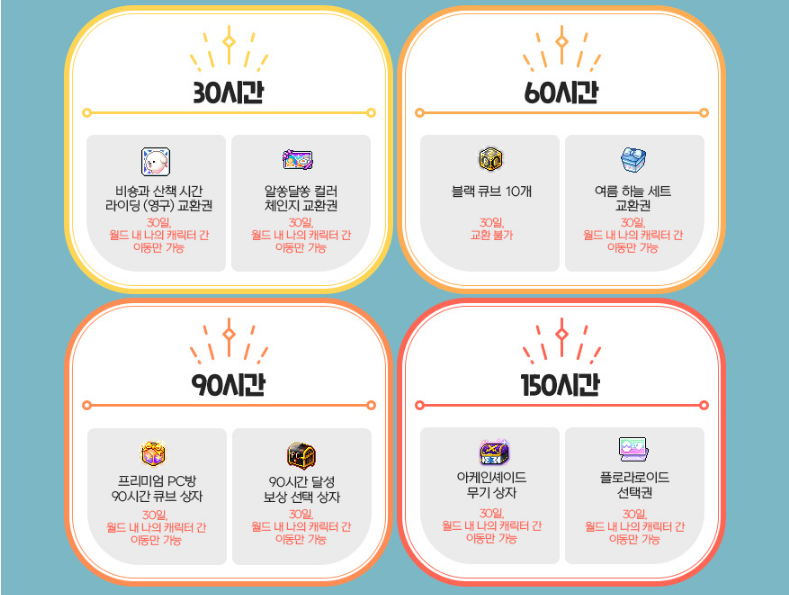 이벤트 기간 중 프리미엄 PC방에 접속한 총 누적 시간에 따라 보상이 지급됩니다.