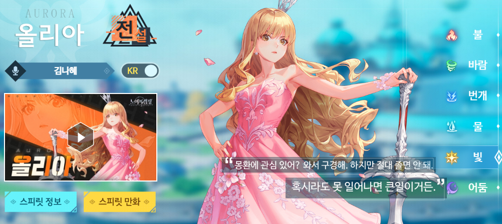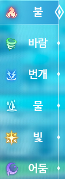 노아의 심장 스피릿마다 불, 바람, 번개, 물, 빛, 어둠 등 고유한 각 속성을 가지고 있답니다.