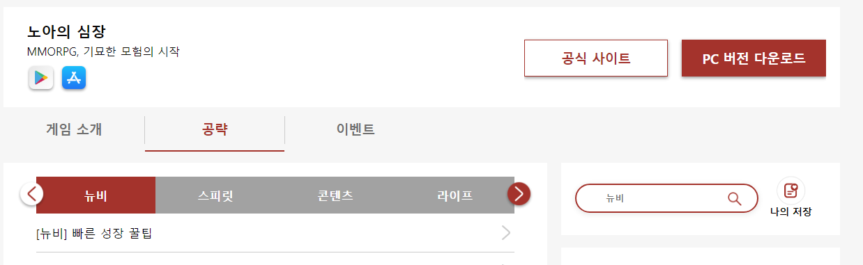 공식 홈페이지로 들어가시면, 구글 플레이와 앱스토어 그리고 노아의심장 PC 다운로드 링크 버튼 세 가지가 뜹니다.
