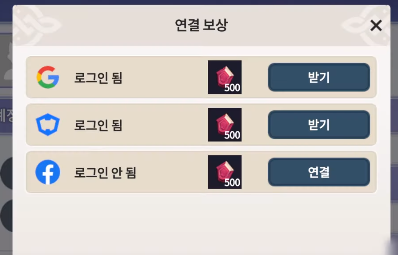 연동 할 때마다 500 크리스탈을 보상으로 받을 수 있으니, 1석 2조입니다.