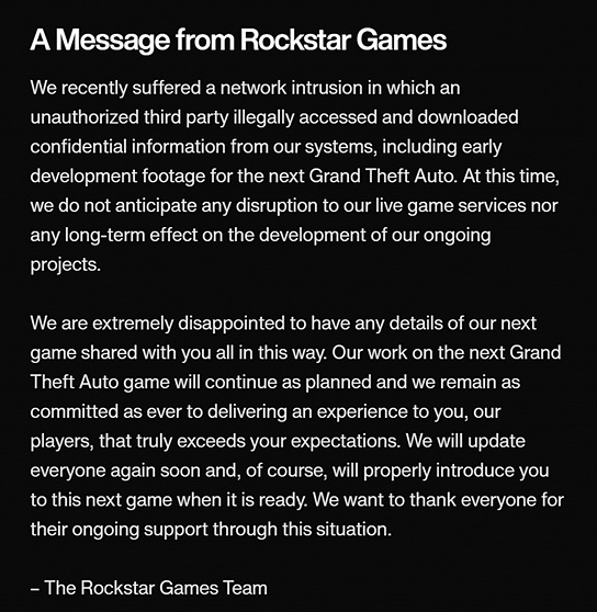 락스타는 성명을 통해 "다음 게임에 대한 세부 정보를 이런 식으로 여러분과 공유하게 되어 매우 실망스럽습니다." 라며 "곧 모든 사항을 업데이트할 예정이며 GTA 6가 준비되면 제대로 소개할 것이고 이 상황을 통해 지속적인 지원을 해주신 모든 분들에게 감사드린다" 라고 말했습니다.
