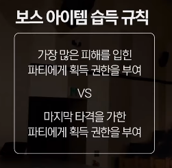 모험가분들의 투표에 따라 [A]안 기존과 같이 가장 많은 피해를 입힌 파티에게 획득 권한을 부여하거나 마지막 타격을 가한 파티에게 획득 권한을 부여하는 [B]안 규칙입니다.