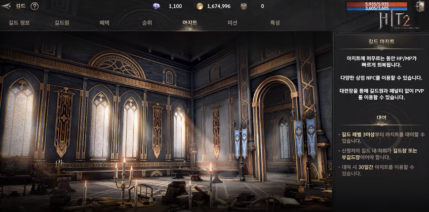 길드 아지트는 추후에 이어질 각종 길드 이벤트를 진행할 장소가 될 것이고 단기적으로는 길드 내부에서 전투 테스트가 가능한 수련장 기능이 추가되어 성장 방향성 체크에 도움이 되실 것으로 생각하고 있다는데요.