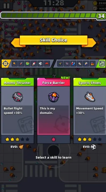 잠금 해제한 무기 진화를 기억하거나 레벨업 보상을 선택할 때 알림 텍스트를 참조할 수도 있습니다. 사용 가능한 레벨업 선택 사항 중 하나로 시너지 효과를 발휘하고 진화하는 아이템은 카드 아래에 텍스트가 표시됩니다.
