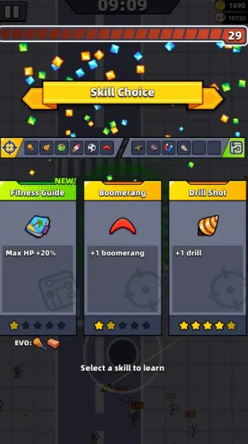 각 레벨에는 3가지 선택 사항이 표시됩니다. 기본적으로 이것들을 다시 굴릴 수 없습니다(먼저 특정 진화가 필요합니다). 선택을 건너뛸 수 없으며, 무기나 패시브 아이템을 획득한 후에는 드롭할 수 없습니다.