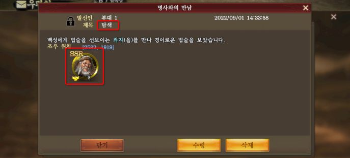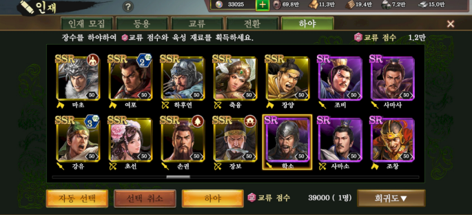 「하야」를 진행하면 교류 점수 및 육성 재료를 획득할 수 있습니다. 또한 하야된 장수는 미등용 상태로 전환됩니다.