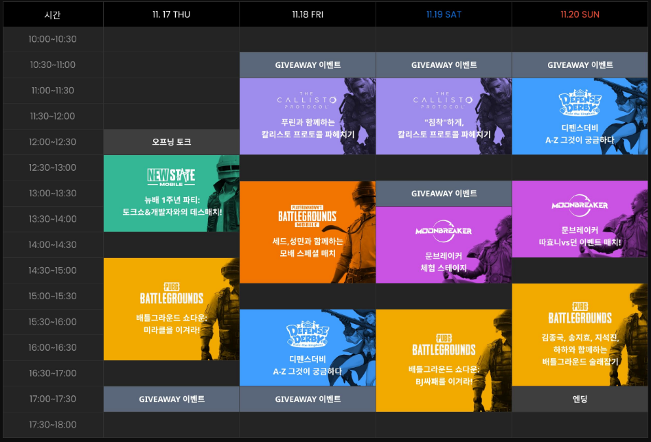 볼거리, 놀거리, 즐길거리 가득한 KRAFTON 부스 무대 프로그램에 준비된 다양한 이벤트에 참여하시고, 풍성한 선물 받아가세요