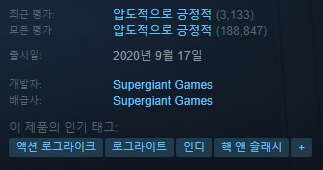 하데스는 스팀 모든평가에서 압도적으로 긍정적인 평가를 받았습니다.