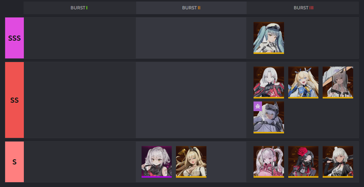 S 티어 버스트3에는 앨리스, 메이든, 슈가가 있습니다.