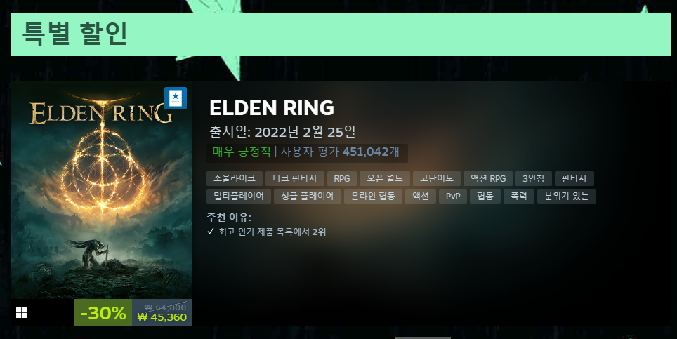 대표적으로 출시 후 한 번도 할인을 진행한 적 없던 엘든 링이 -30% 할인에 돌입했습니다.