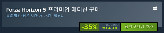 포르자 호라이즌 5의 프리미엄 에디션은 2022 스팀 겨울할인을 받아 64,930원에 구매 가능합니다.