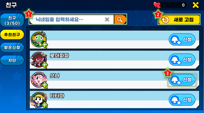 ① 상대방의 닉네임을 검색하여 친구 신청을 보낼 수 있습니다.