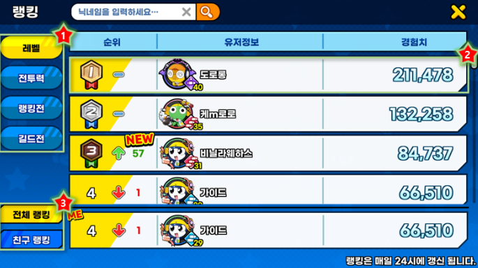 ③ 전체 유저를 대상으로 한 랭킹, 친구 목록에 등록된 유저만 대상으로 한 랭킹을 확인할 수 있습니다.