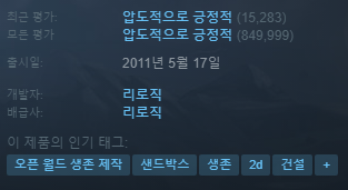 테라리아는 스팀 모든 평가에서 압도적으로 긍정적인 평가를 받았습니다.