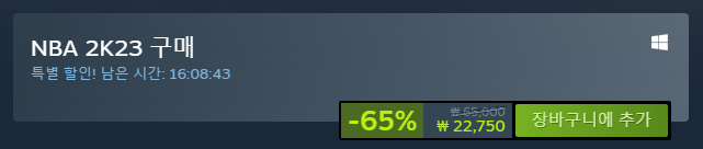 NBA 2K23의 스팀 판매 가격은 스팀 겨울 할인으로 22,750원 입니다.