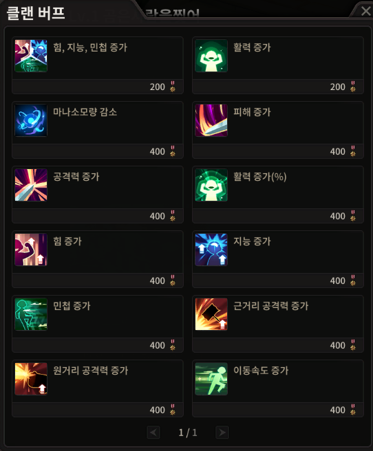클랜 공금으로 클랜 버프 및 클랜 경험치를 구매할 수 있습니다.