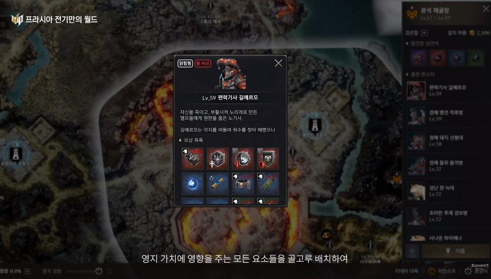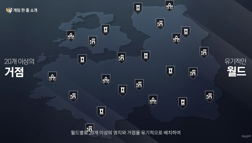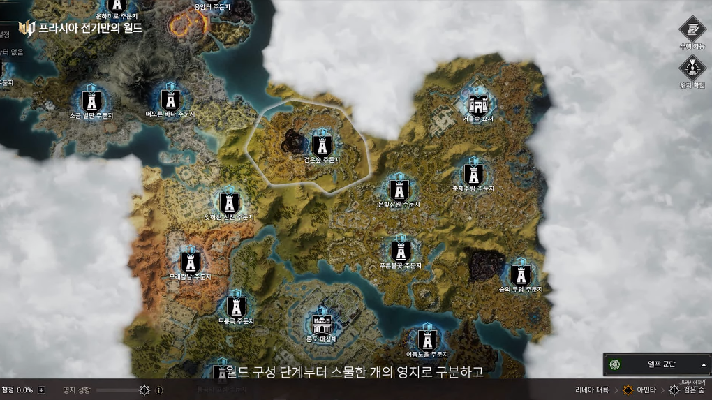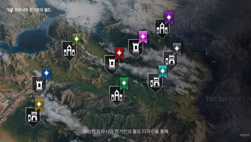 프라시아 전기 월드에는 21개의 거점이 존재하며, 거점마다 사냥터, 보스 난이도, 채집 자원 종류가 다릅니다. 심리스 필드에서 이루어지며, 특정 결사 (길드) 가 독점하는 것을 방지하기 위해 거점은 골고루 배치되어 있다고 해요.