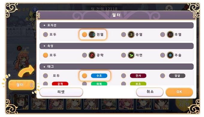필터를 통해 포지션과 역할에 맞는 이능자를 검색할 수 있습니다. 지금 필요한 전열과 수호로 필터를 설정해봅시다.