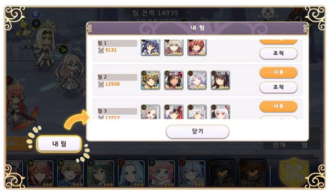 전투준비에서 쓸 수 있는 다른 기능들도 알아봅시다. 내 팀에서는 미리 저장해놓은 팀을 불러올 수 있습니다. 물론 새로 팀을 짜서 저장하는 것도 가능합니다.