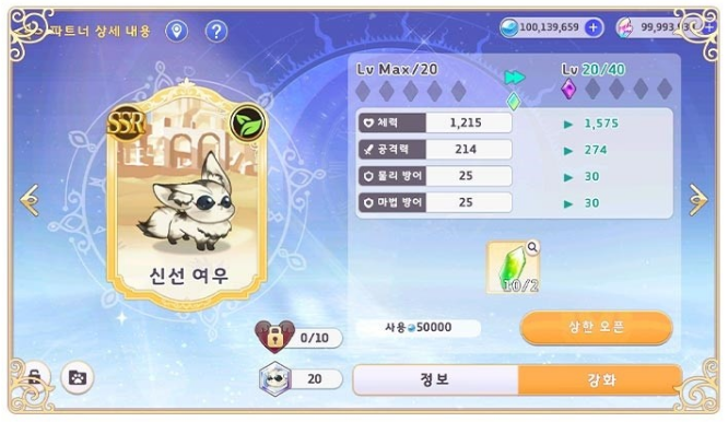 파트너는 슬라임을 활용하여 성장시킬 수 있고, 레벨 상한마다 돌파를 통해 더욱 강하게 만들 수 있습니다. 돌파를 진행하면 능력이 더욱 증가하고 레벨상한이 해금되며 가호효과, 발동효과가 증가하기도 합니다.
