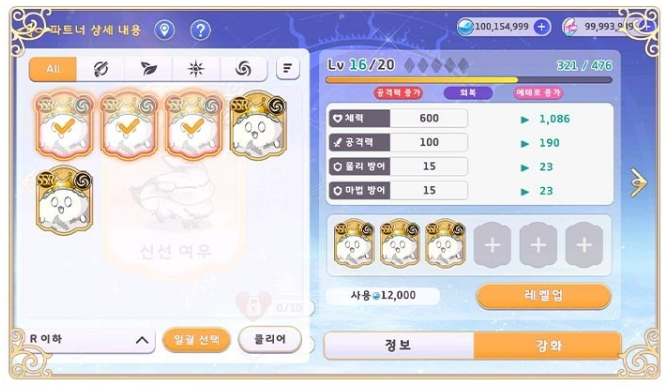 육성 메뉴에서 [파트너]로 이동해서 보유한 파트너를 확인하고 파트너를 성장시킬 수 있습니다.