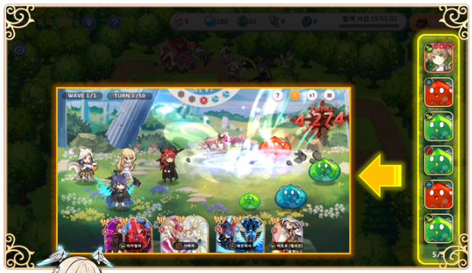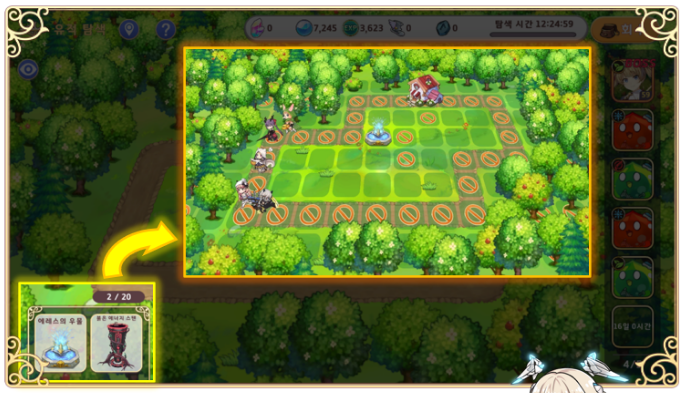 숲 속 오두막을 누르면 탐색 보너스 팀을 편성할 수 있습니다. 각 편성에는 추천 편성이 있는데, 추천 사항들을 잘 참고하면 추가 탐색 능력을 얻을 수 있답니다.