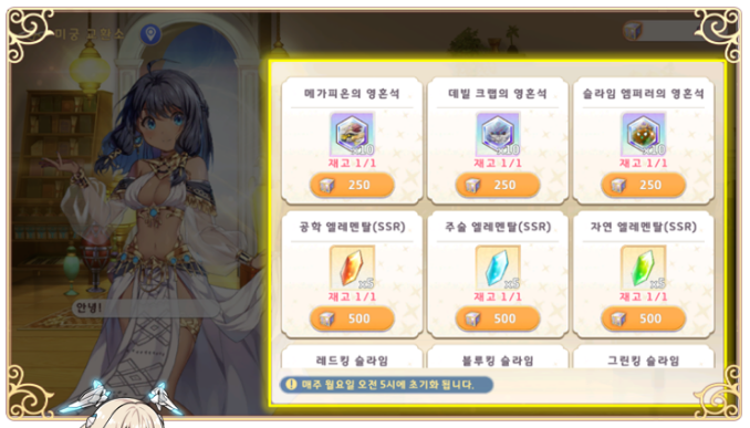 마지막으로 미궁에서 획득한 '미궁 큐브'를 통해 교환소에서 '파트너 영혼석', 초월 재료인 '엘레멘탈' 등 다양한 아이템을 교환할 수 있습니다. 미궁 교환소의 아이템 재고는 매주 월요일 05시에 초기화됩니다.