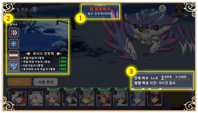 팀 전투력이 필수 전투력을 초과해야 탐색 시작이 가능합니다.