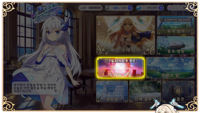 모험에서 '드라웁 미궁' 메뉴를 볼 수 있을 겁니다. 미궁은 메인 스테이지 6-15를 클리어해야 입장이 가능하니 꼭 먼저 메인 스테이지를 클리어합시다.