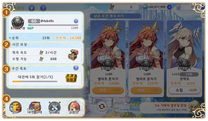 2. 결투의 무훈 획득량을 확인하고 수령할 수 있는 곳입니다. 결투의 무훈을 통해 교환소에서 이능자의 추억이나 유용한 아이템들을 획득할 수 있으니 결투의 무훈을 꼭 수령합시다.