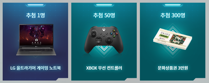 또한 추첨을 통해 LG 울트라기어 게이밍 노트북, 엑스박스 무선 컨트롤러, 문화상품권 3만원을 지급한다고 합니다.
