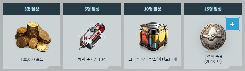 십만 골드, 체력 주사기 10개, 고급 염색약 박스 1개, 우정의 증표 아카이브 등 다양한 보상이 주어지네요.