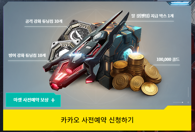 공격 강화 튜닝칩 10개, 탈것 (팬텀) 지급 박스 1개, 방어 강화 튜닝칩 10개, 100,000골드 등 카카오 사전예약 시 다양한 보상이 주어진다고 하는군요. 마켓 사전예약 시 정식 오픈 후 보상을 받을 수 있다고 합니다!