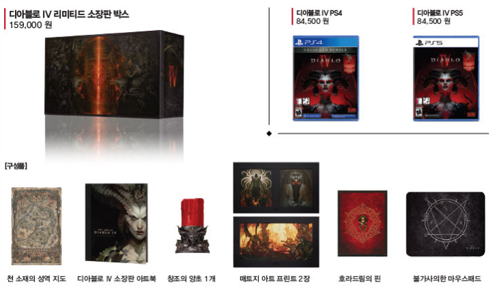 먼저 디아블로 4 세계관 속 상징적 존재인 릴리트와 이나리우스가 멋지게 새겨진 장식품인 '창조의 양초', 패브릭 소재의 성역 지도, '호라드림' 핀 및 디아블로 4 소장판 아트북 등이 담긴 '디아블로 4 한정 소장판 박스(Diablo IV Limited Edition Collector’s Box)'가 전시 및 판매되어 직접 해당 제품을 확인하고 구매할 수 있다고 합니다.