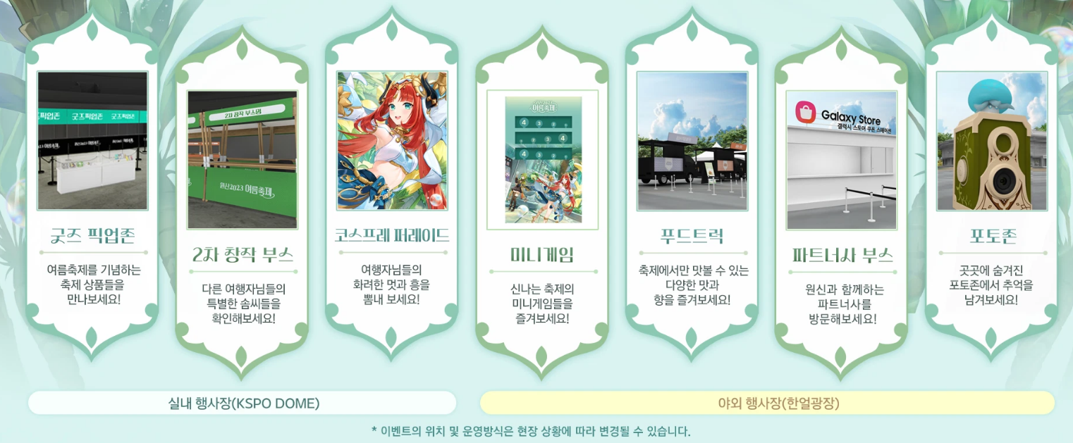 호요버스는 29일, 원신 국내 최대 행사 '원신 2023 여름축제'를 오는 7월 20일부터 23일까지 개최한다고 밝혔는데요. 이번 행사는 원신의 네 번째 지역 수메르를 콘셉트로 실내 행사장인 올림픽체조경기장과 야외 행사장 한얼광장에서 진행됩니다. 쾌적한 관람 환경 및 편의 제공을 위해 실내 행사장은 유료로, 야외 행사장은 무료로 나누어 운영합니다.