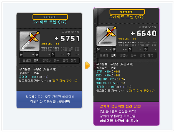 - 강화 성공 시, 성공한 횟수만큼 아이템명 상단에 별(★) 획득